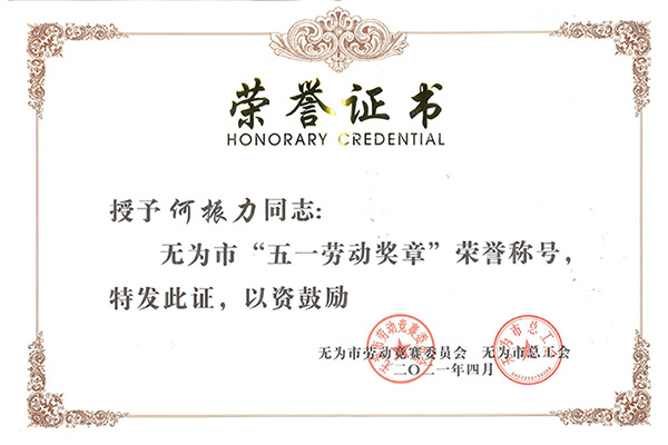 公司研發(fā)部主任、高級工程師何振力同志榮獲2021年度無為市“五一勞動獎章”榮譽稱號
