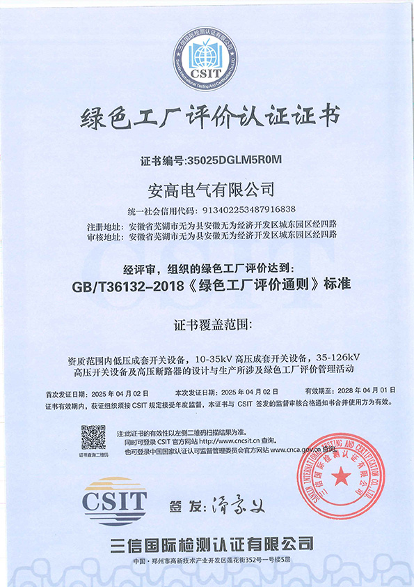綠色工廠評價認(rèn)證證書