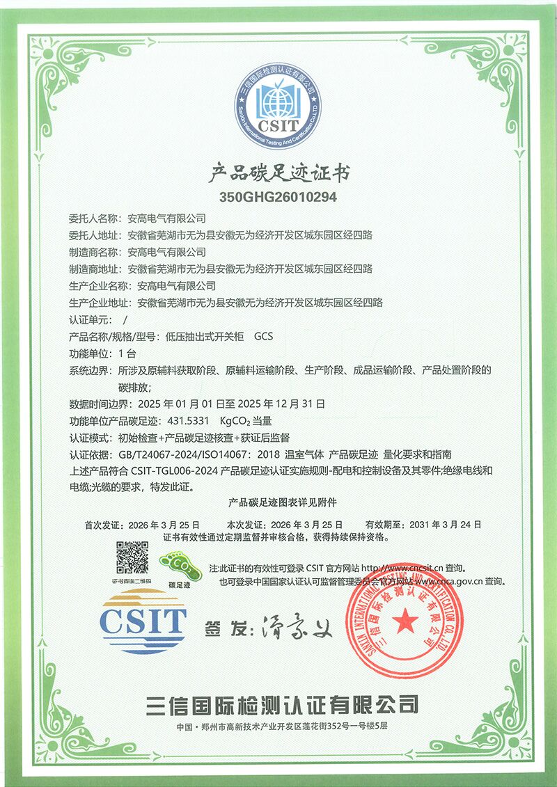 低壓開關(guān)柜產(chǎn)品碳足跡證書